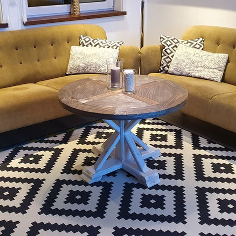 Rundt salongbord i rustikk stil. Beiset gran i drivved farge. Vi lager dem i forskjellige farger og størrelser.